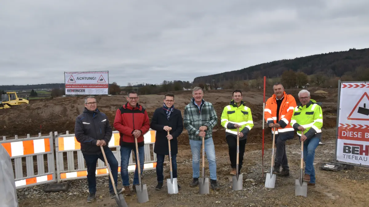 Sie greifen symbolisch zum Spaten und freuen sich, dass die Erschließungsarbeiten im Seebühl II begonnen haben (von links): Alexander Hassel und Christian Weber vom Steißlinger Bauamt, Bürgermeister Benjamin Mors, Daniel Behringer (Behringer), Markus Besnecker (Ingenieurbüro Raff), Bauleiter Volker Hirt (Behringer) und Ingenieur Burkhard Raff.
